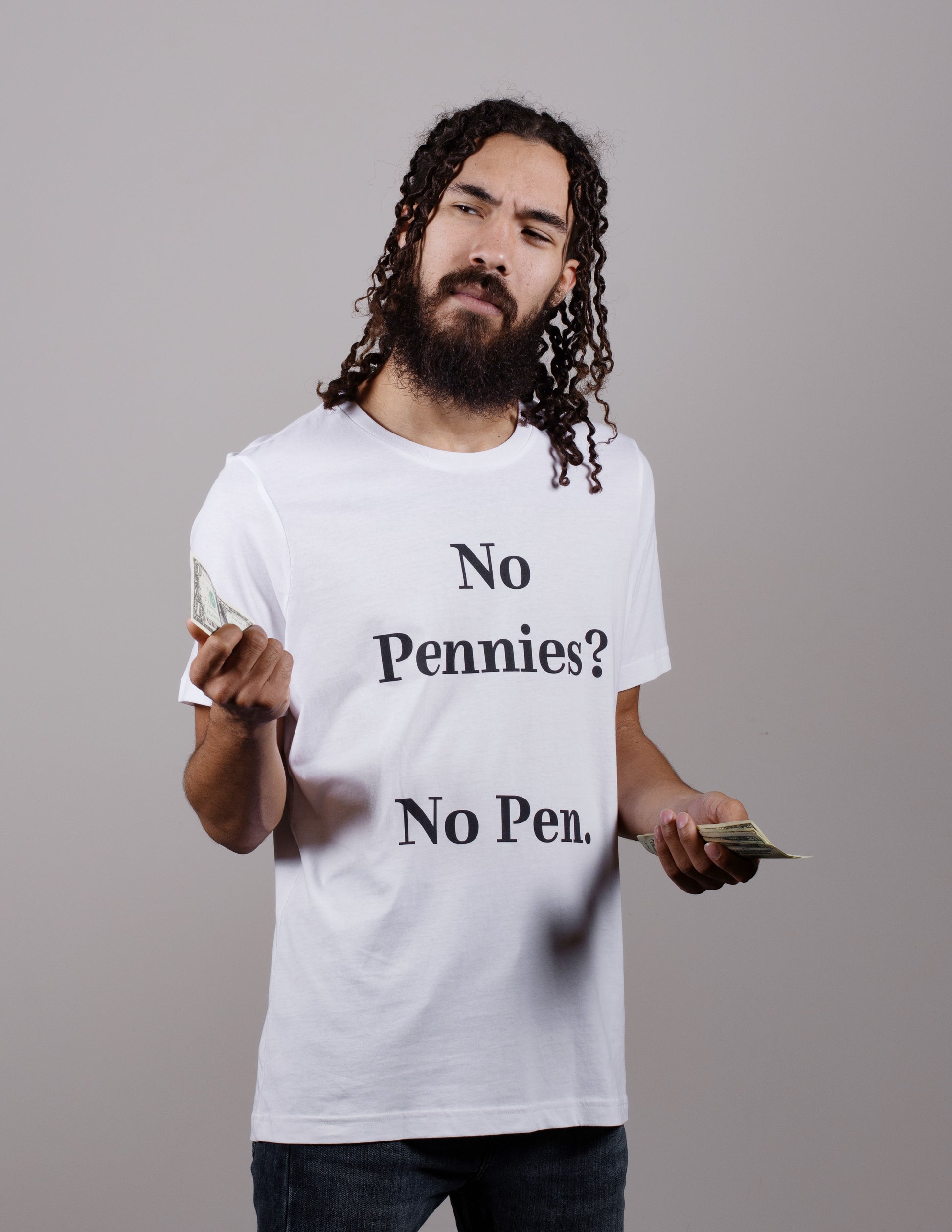 Pennies & Pens No Pennies? No Pen. Unisex T-Shirt is made of 100% Organic Cotton, certified by GOTS.