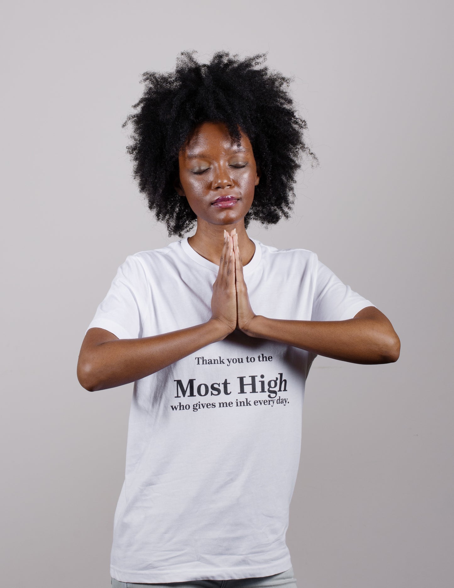Pennies & Pens Thank You To the Most High Unisex T-Shirt is made of 100% Organic Cotton, certified by GOTS.